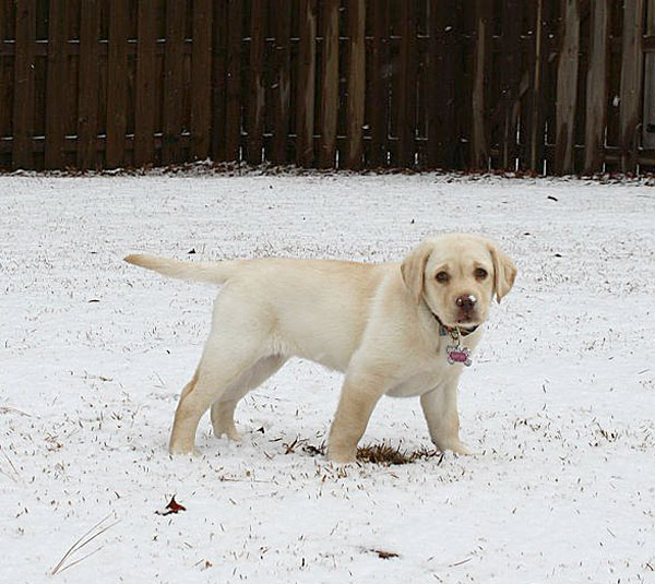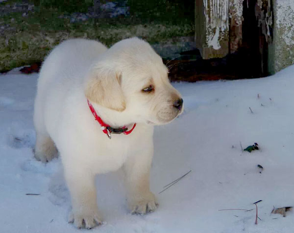 Above is one of our 2013-14 winter puppies exploring the new snow in the yard